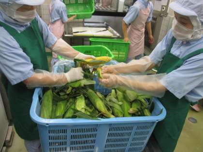 とうもろこしの皮を剥いた後、3回洗い、1/3にカットして、スチームコンベクションオーブンで仕上げました。