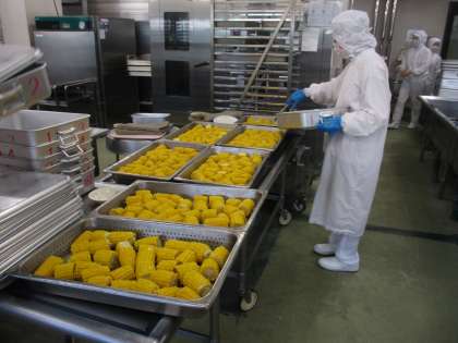 とうもろこしの皮を剥いた後、3回洗い、1/3にカットして、スチームコンベクションオーブンで仕上げました。