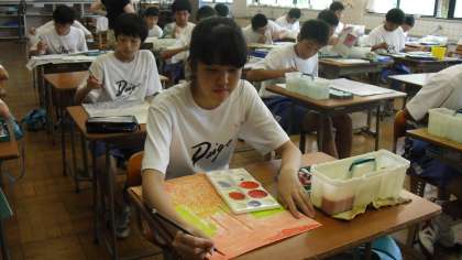 今は、風景画をやっています。大分仕上げってきました。自分だけの風景画にするために、いろいろと工夫をしています。阿部さんは線描と点描を使い分けています。伊澤さんは太い線描を前後、左右と多用し、奥行きや動きを表現しようとしています。中野さんは夕方の風景をオレンジ、黄色という明るい同系色の色で仕上げています。その他にも個性あふれる絵で教室中が一杯です。完成が楽しみです。