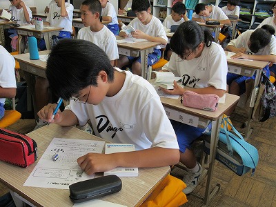 お薦め本のポップの作成が終わり、今日は発表会です。発表メモをまとめた後、グループでの発表会に入っていきます。ポップにどんな言葉を切り取って書き込んだのか。また、その理由は……。発表会、盛り上がりそうです!