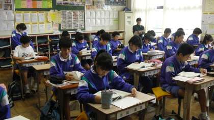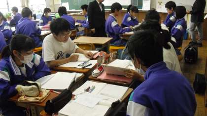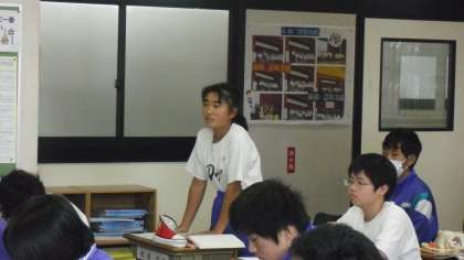 太宰治の「走れメロス」の授業です。「なぜ、到着が日没ぎりぎりになったのか」を読み取り、いろいろな理由の中で何が一番の要因だったのかを班で話し合いました。今日は、研修ということで、沼津市教職員研修センターの村瀬三千代師範がお見えになり、授業を参観していただきました。五小出身の生徒にとっては、小学校時代の校長先生ということもあり、懐かしがっている生徒も多くいました。