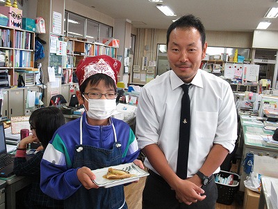 2年4組の山田倫当さんが、3時間目の調理実習で作った「鯖の味噌煮」を職員室の岩本先生に届けにきました。とてもおいしそうでした。