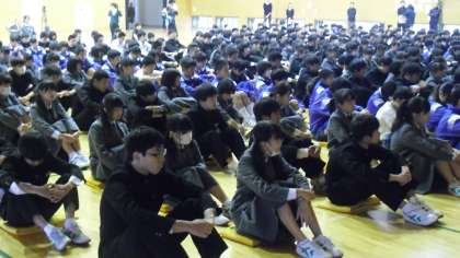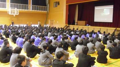 明日からの職場見学、職場体験、高校説明会を前に、全校で「あるレジ打ちの女性」のDVDを体育館で視聴しました。少しでも気持ちを高め、明日に臨んでほしいと思います。