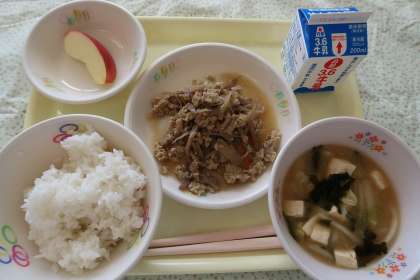 ごはん 牛乳 豚肉の柳川煮 白菜と豆腐のみそ汁 りんご