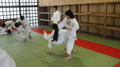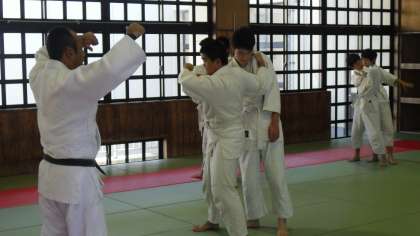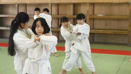 柔道の授業です。今日は、立技のうち「体落とし」です。一つ一つの動作の合間に、佐藤先生から「崩すと同時に踏み込む」「引き手は上げたまま足を出して横回転」「受け身をしっかりとる」などの細かな指示が飛びます。安心、安全面に最大限配慮し、授業が行われていました。