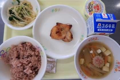 赤飯 牛乳 鶏肉の味噌焼き 野菜の酢醤油あえ