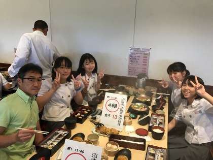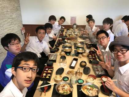 4組 レストラン嵐山にて昼食です。鳥すき鍋を食べています。