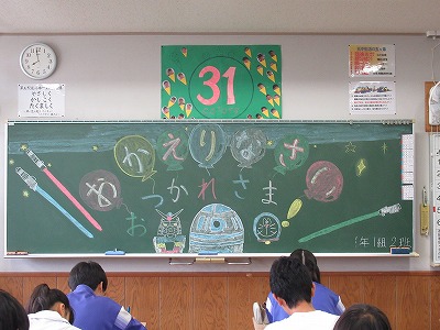 黒板には、2・3年生のどのクラスにも「おかえり!」とメッセージが書かれていました。これは、1年生が先週の奉仕活動の時に、サプライズとして一生懸命黒板にかいていたものです。出掛けるときにいただいた3年生のメッセージへのお礼ですね。