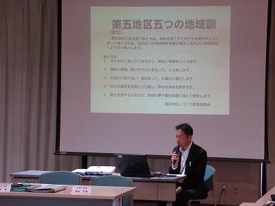 各校の校長によるあいさつや全体の自己紹介後、「第五校区 小中一貫教育」について本校奥村校長が「『地域とともにある学校』づくりに向けて」というタイトルで話をいたしました。