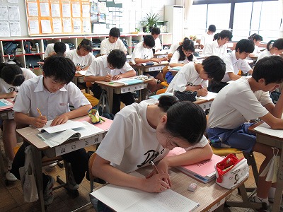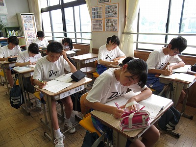 井上ひさしの「握手」に入っています。今日は、文章中における「握手」の役割について考えました。まずは、自分なりの考えをノートに書いていきました。皆、教科書をじっくり読み、根拠を大切にしながらまとめていました。