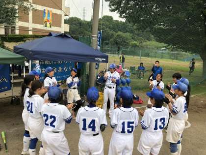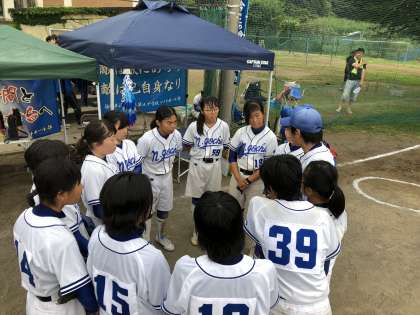試合を前に円陣を組み、戦術の確認です。気持ちを一つに、頑張れ!五中ソフトボール部!