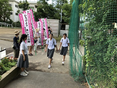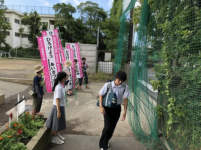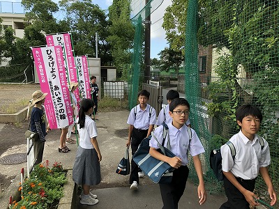 今日は7月20日、「0」の付く日は、第五校区のあいさつ運動の日です。今日は、1学期最後のあいさつ運動です。終業式準備のため、生徒会本部役員の生徒は参加できませんでしたが、専門委員長が学園通りであいさつ運動を行いました。東門と西門では、3年生の保護者、PTA本部の方があいさつ運動をしてくださいました。御協力ありがとうございました。