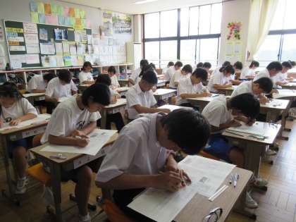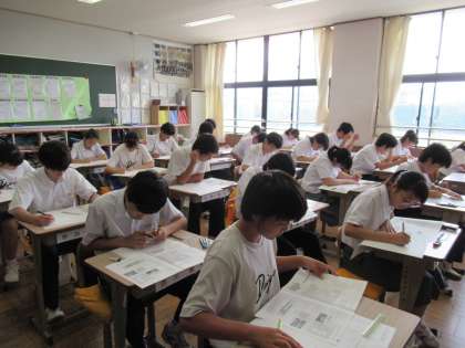 今日は、3年生は学力調査、2年生は実力テスト、1年生は「夏休みの友」テストを受けています。皆、真剣に臨んでいました。