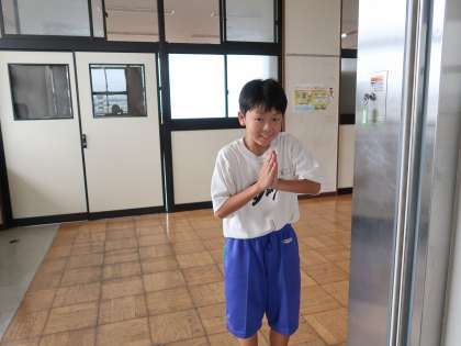 2枚目は、配膳室で「いただきました。」の挨拶をしている1年生です。