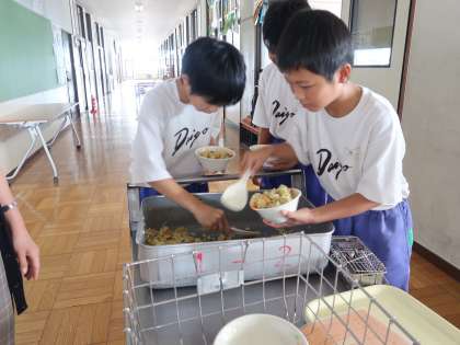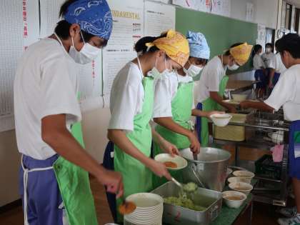 写真は、1年2組です。マスク、三角布、エプロンをしっかり身につけて配膳しています。