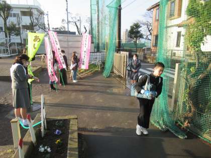 今日は「0(ゼロ)」の付く日、第五校区あいさつ運動の日です。今朝はとても暖かく、生徒からは気持ちのよいあいさつが聞かれました。清々しい一日のスタートです。