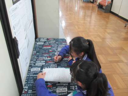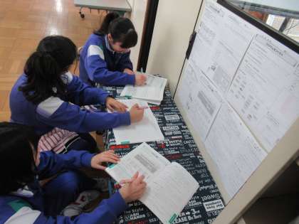 放課後の時間、3年生が廊下の学習掲示物を活用してテスト勉強をしていました。