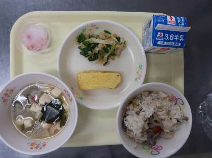 五目寿司 牛乳 厚焼き卵 野菜のごまあえ すまし汁