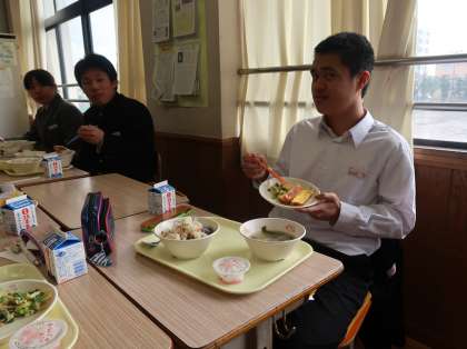 写真は、配膳室前の3年生と3年2組の給食時間です。