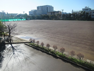 今日は昨日の大雨、雹が嘘のような晴天。真っ白な富士山がくっきり見えます。グラウンドはぬかるんではいるものの、朝日に照らされまぶしいくらいです。