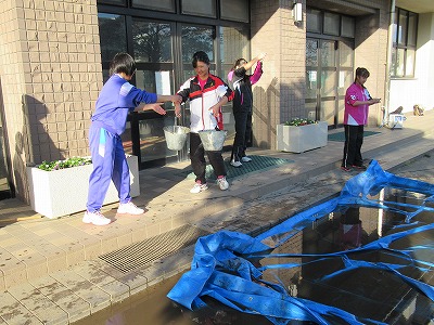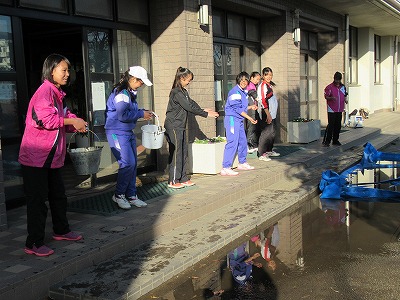 バケツリレーで池の水を運んでいます。女子テニス部が手伝ってくれました。