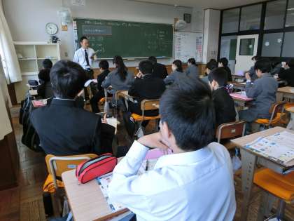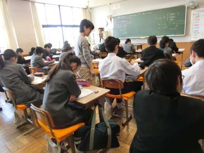 1年3組の英語の授業です。「アルファベットの音を知ろう!」という課題のもと、音声を聞き取っていました。支援員さんも補助に入っていました。