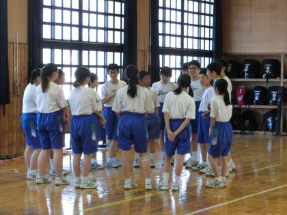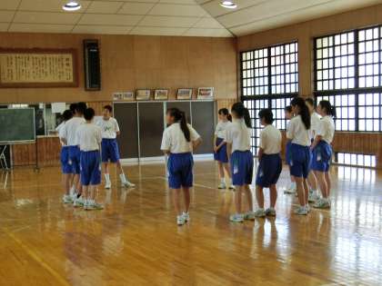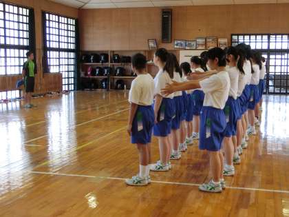 2年2組の体育です。2列に整列したあと、グループに分かれて隊形変化について話し合っていました。