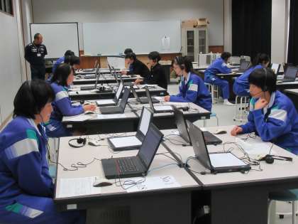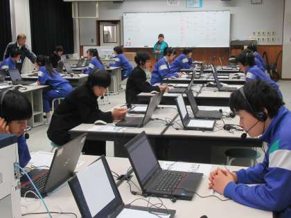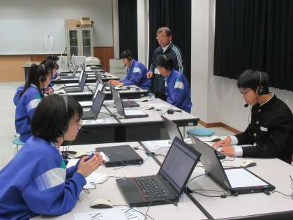 今年度初の試みとして、全国学力・学習状況調査に英語が加わりました。午前中に「読むこと」「書くこと」「聞くこと」の調査を受け、午後は「話すこと」の調査を行いました。「話すこと」の調査は、各クラス2グループに分かれ、1グループずつ順番にパソコン室で実施しました。聞こえてきた質問に対して、英語で答えていきました。