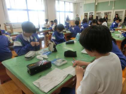 1年2組は家庭科の授業を行いました。学習課題は「ぞうきんに自分の名前を塗ってみよう。」でした。小学校で学習した玉結び、玉どめ、並縫いを思い出しながら取り組んでいました。