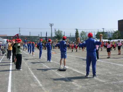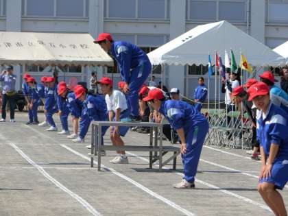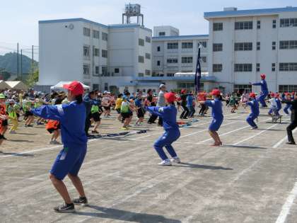 競技の前に、みんなで「スポレッチ沼津」で体をほぐしました。五中生がお手本となって前に並んで体操しました。小学生が一生懸命見ながら体を動かしていました。