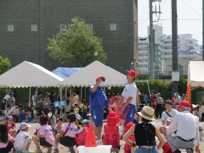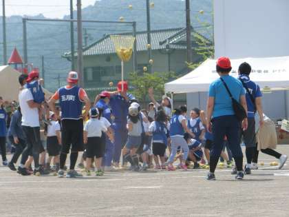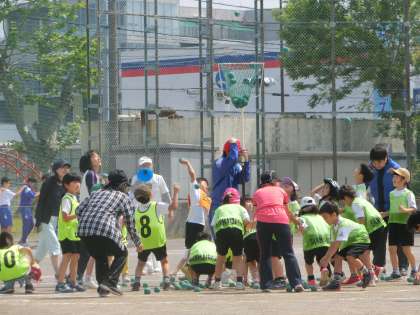 「連合玉入れ大合戦」です。小学校1、2年生が一生懸命、かごをめがけて玉を投げていました。