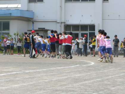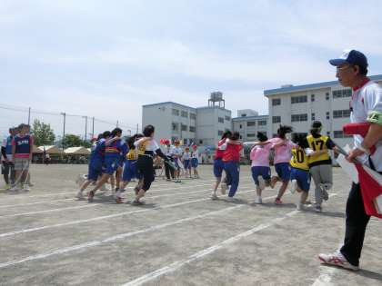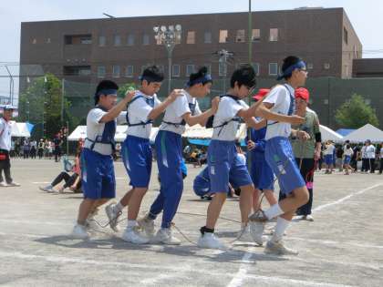 「一身同体」は二人三脚やムカデなどでリレーしていく競技です。中学生は各町内の選手としても大活躍していました。