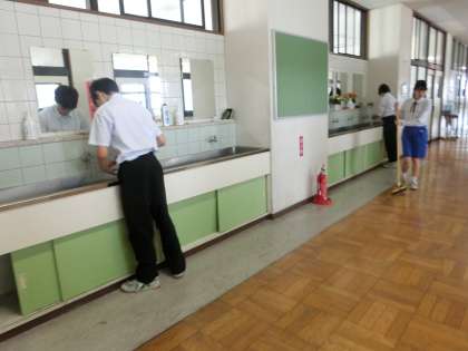 黙働清掃中です。月曜日の朝に校内をきれいに整え、気持ちよく生活を始めようとする心が伝わってきます。