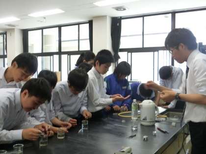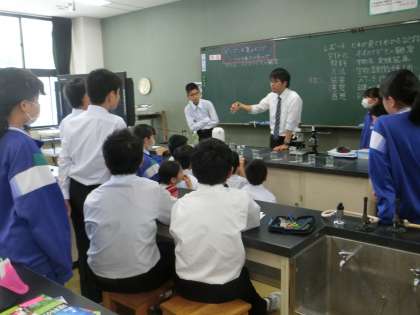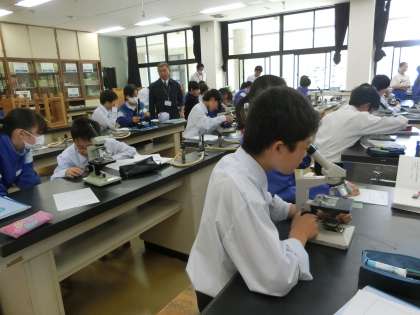 1年3組 理科の授業です。「デンプンは葉のどこでつくられているのか?」という問いのもと、オオカナダモの観察をしていました。慎重にプレパラートを作り、生物顕微鏡で観察していました。