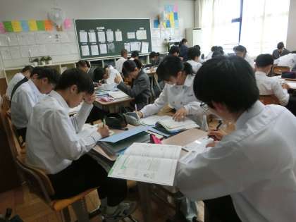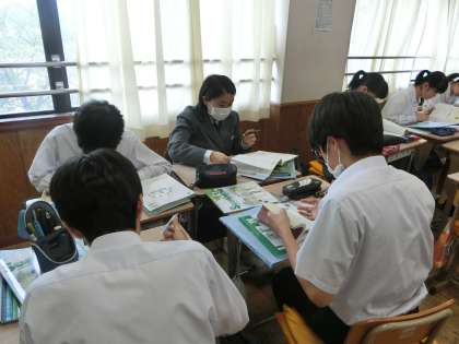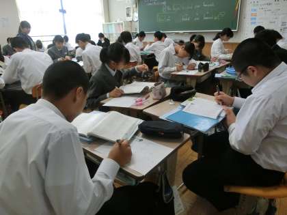 3年2組 英語の授業です。ちょうど、終わったことを尋ねたり、答えたりする練習をしていました。分からないところは友達と教え合って進めていました。