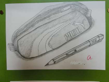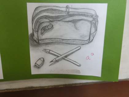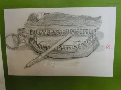 1年生の美術作品です。よく見て描いていることが伝わってきます。立体感や質感が表現されています。