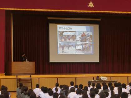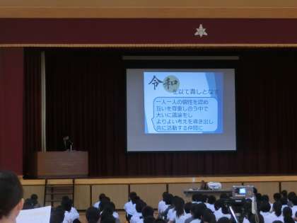 5月の朝礼を行いました。5月10日のあいさつの輪の日、12日の五小校区祭のふり返りをし、地域の人たちとつながること、地域の役立つ力となることを伝えました。また、令和にちなんで「和を以て貴しとなす」について話をしました。