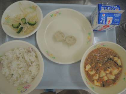 【献立】麦飯 牛乳 麻婆豆腐 しらすシューマイ ボイルドサラダ