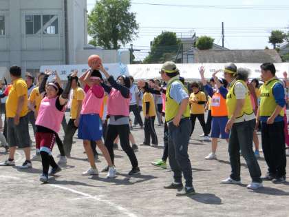種目「メデシンボール」の様子です。同じ町内の人たちと声を掛け合い力を合わせて頑張っていました。
