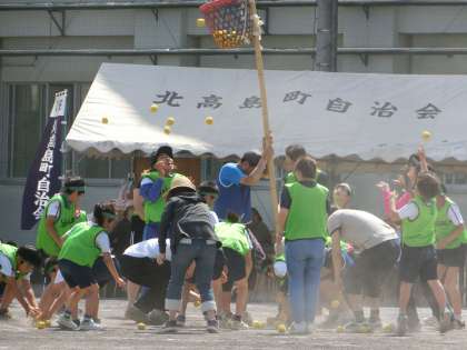 種目「玉入れ」の様子です。小学生、中学生、大人たち、みんなかごを目指してたまを投げていました。