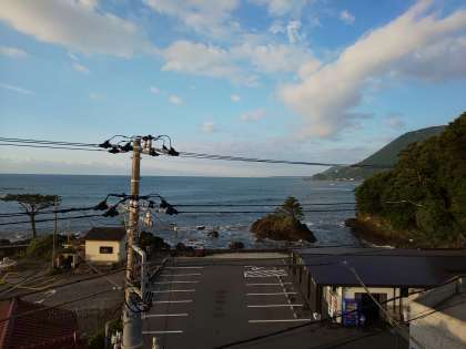 おはようございます。自然教室2日目、晴、気持ちのよい朝を迎えています。朝の海の様子です。
