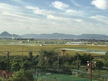 おはようございます。ホテルから眺める朝の景色です。青空に白い雲がきれいです。今日は暑くなりそうです。