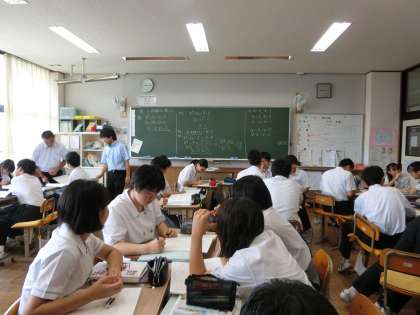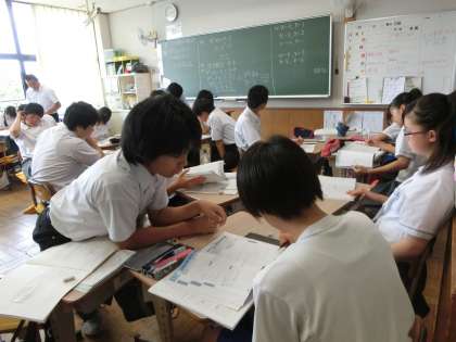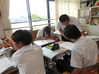 3年1組 数学の授業です。2次方程式を解いていました。練習問題に取り組み、分かりにくいところは互いに説明し合って確認していました。習熟の時間です。