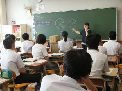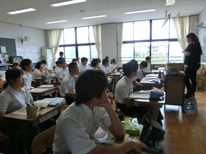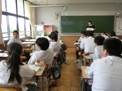 3年3組 英語の授業です。プログラム4の単語について学習していました。Vの正しい発音の仕方を先生が説明していました。