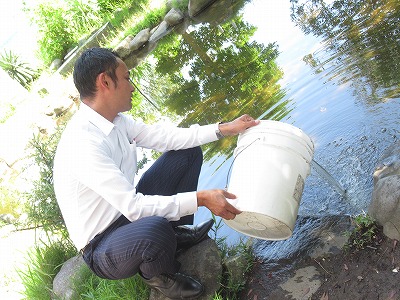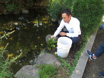 本日午後、沼津杉崎郵便局の局長様が来校し、池にめだかを放流してくださいました。お持ちくださった水草を浮かべた後、御自身が育てたという100匹のめだかを池に放ちました。