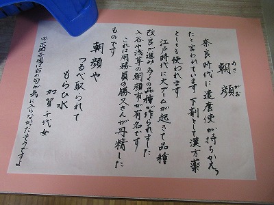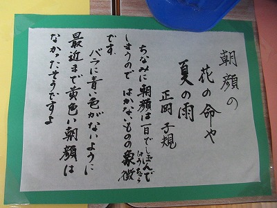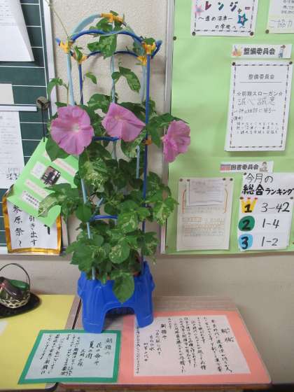 今朝出勤すると、職員玄関に置いてあった鉢植えの朝顔が咲いていました。用務員の勝又さんが育てているもので、今日初めて花を開きました。子どもたちに素敵な朝顔を見せたくて、豊田先生が事務室横に運び、一筆添えてくださいました。
