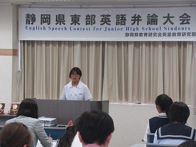 本日、沼津教育会館にて静岡県中学校東部英語弁論大会が開催され、本校から3年生の生徒が出場しました。優秀賞に輝いた沼津市の大会の時よりもさらに表現力が増し、自分の考えを流暢な英語で述べることができました。「Like a Girl!」大変立派な発表でした。発表後は、会場から大きな拍手を頂戴しました。