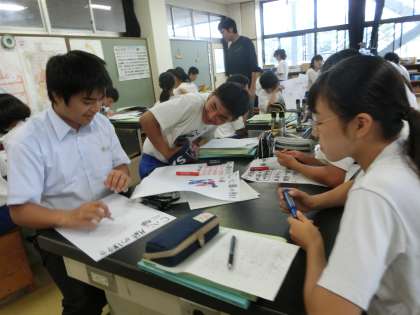 2年生の理科の授業の様子です。「心臓はどのような仕組みで体中に血液を送っているの?」という課題のもと、図やキーワードを使って分かりやすくまとめていました。よりよい説明ができるようにと、グループの友達同士で意見を交換していました。