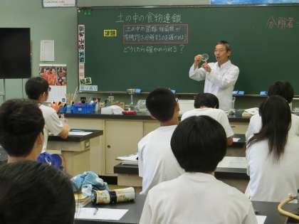 3年4組、理科の授業の様子です。「土の中の菌類、細菌類が有機物を分解するのを確かめよう。」という課題のもと、どうしたら確かめられるか、意見を出し合っていました。寒天培地に液を加え、その変化を観察していくそうです。