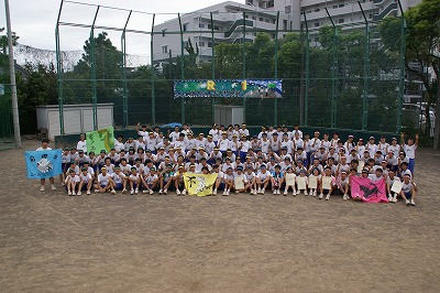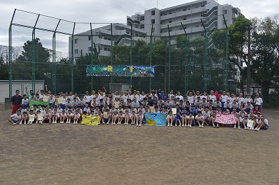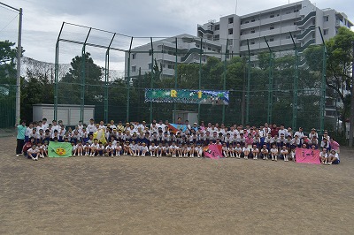 横断幕前で撮った各学年の集合写真です。皆いい笑顔です!